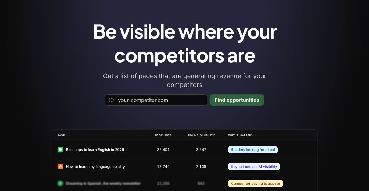 Discover how your competitors are generating revenue, and get the same visibility where it matters with this competitor intelligence tool.