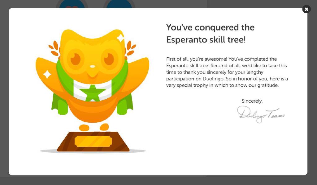 We built one of the most popular Esperanto courses with a peak at 367,000 simultaneous active learners (and probably 700,000+ enrollees over time), with at least 36,500 completions.Building on the top of Duolingo gave us access to technology and its network of users to both provide better education and get a lot of free exposure, reaching 1.7 million enrollees across its different versions. Plus, it continued to improve over time, like when shipping time-decay flashcards.